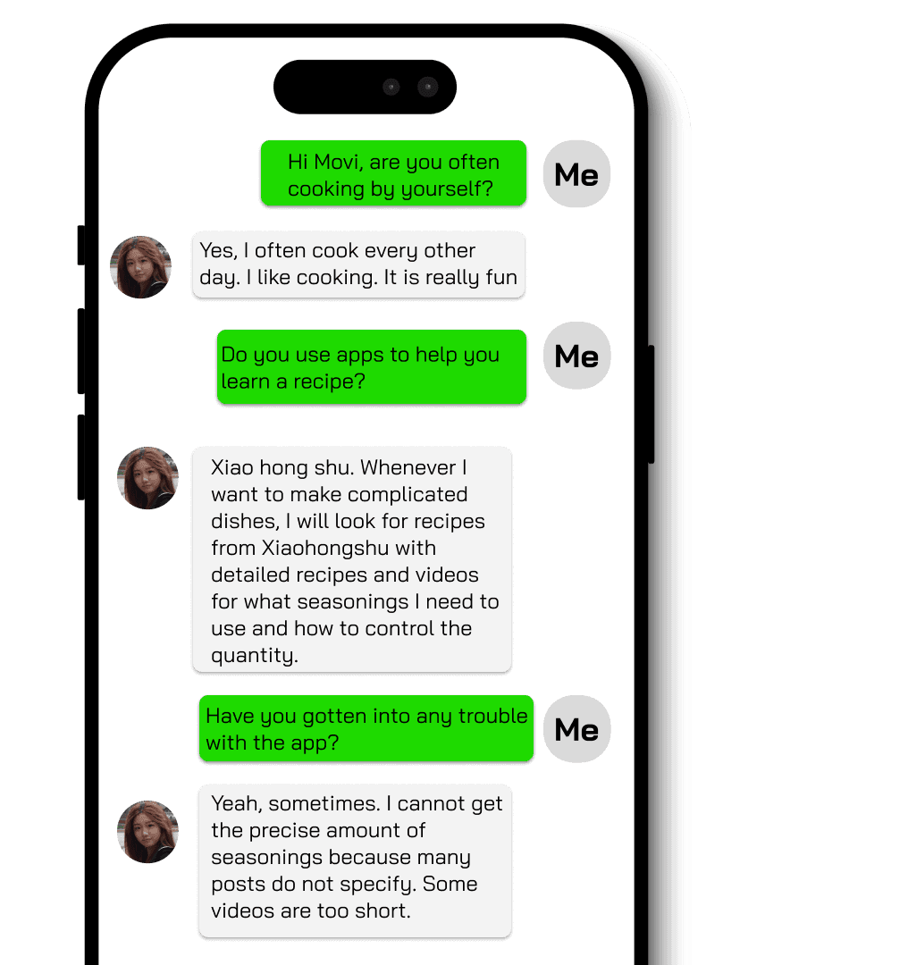 As an international college student, I often need to make dishes on my own. However, after trying several different apps for recipe references, I found it hard to catch up with the video tutorials, and sometimes the instructions are too vague. For instance, the tutorial does not specify the ingredients for the dish, which makes me hard to get the correct ingredients accordingly. Therefore, I start to question myself, am I the only one who encounter such problems? With the idea in mind, I created a survey and sent it out to other students on campus and hope to gather some responses. Meanwhile, I was also thinking about how can those problems be solved.